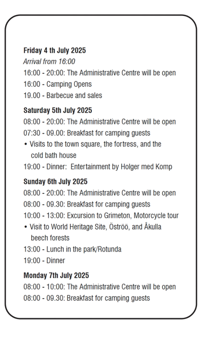 The event has been scheduled to coincide with the FIM Rally in Lillehammer, Norway, allowing participants to enjoy both events during one holiday. For those wishing to arrive early, event facilities will open at midday on Friday, July 4th. The meeting will run from Friday, July 4th, to Sunday, July 6th, with participants departing after breakfast on Monday, July 7th.